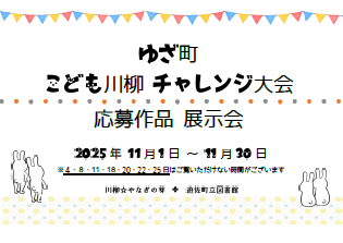 2025年11月1日 / 最終更新日 : 2025年11月1日 yuza_town_library 学び合いスペースのお知らせ こども川柳展 期 間: 2025年11月 1日(土)~ 11月30日(日) ※4・8・11・20・22・25日はご覧いただけない時間がございます。場 所: 遊佐町立図書館 視聴覚講座室 遊佐町内の小学生から、今年もたくさんの川柳が届きました。作品のひとつひとつにハッとしたり、クスッとしたり。大人も子どもも、十七音の世界をどうぞお楽しみください。主催:遊佐町立図書館 共催:川柳☆やなぎの芽 senryu_2511ダウンロード